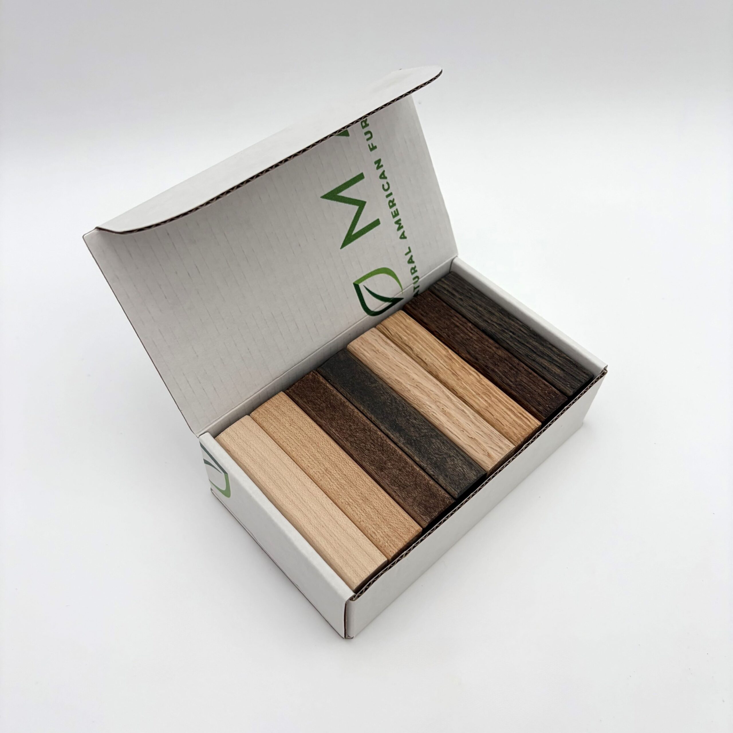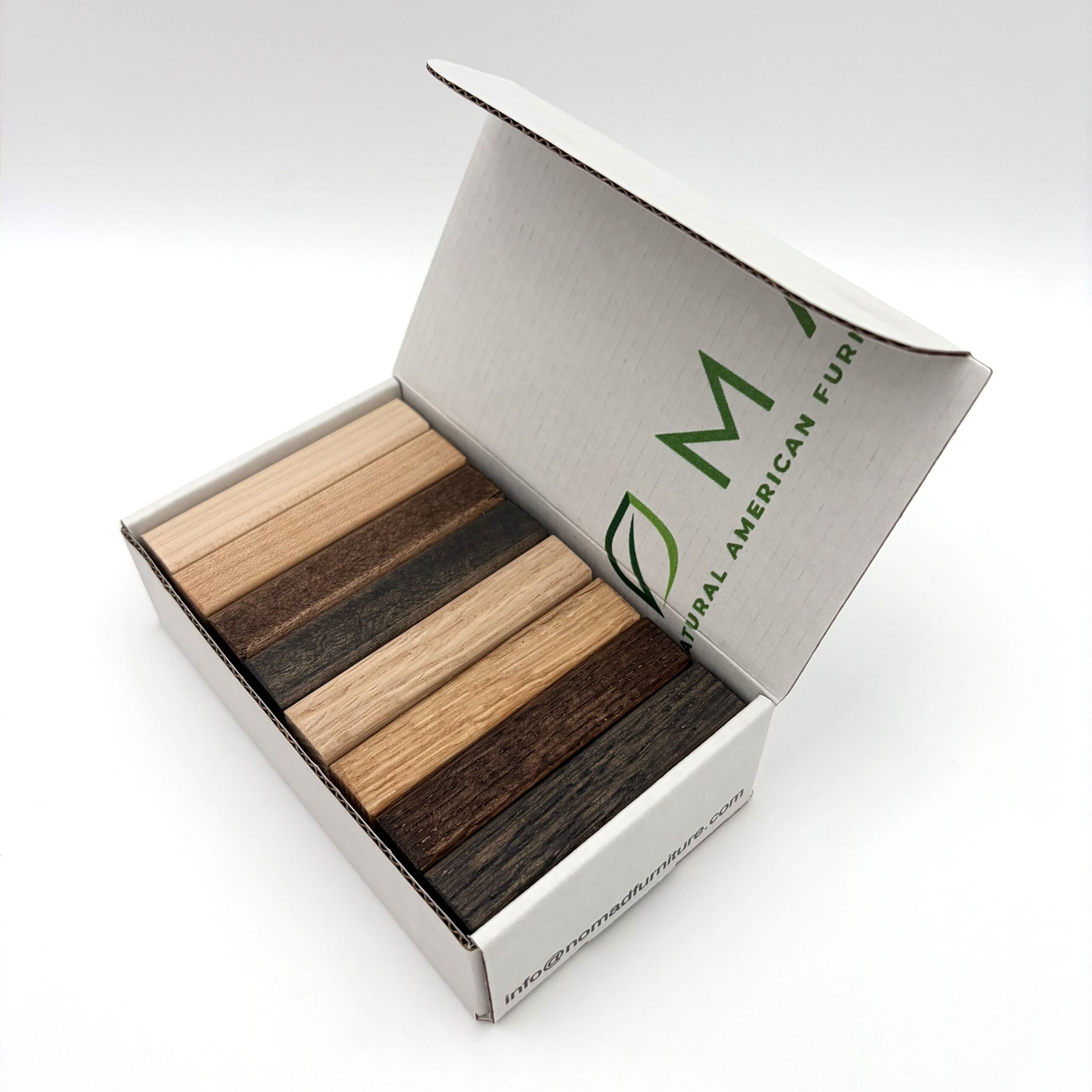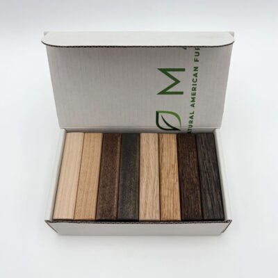 Explore all of our finish options in one complete sample kit. It includes eight solid hardwood samples—each finish applied to both maple and oak—so you can compare color, tone, and grain side by side.