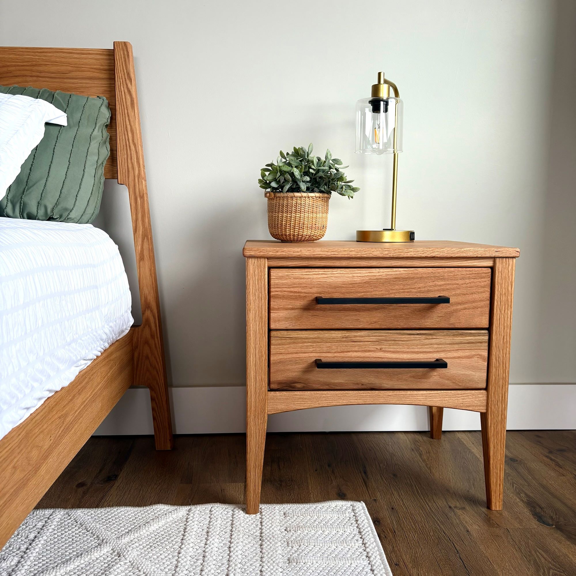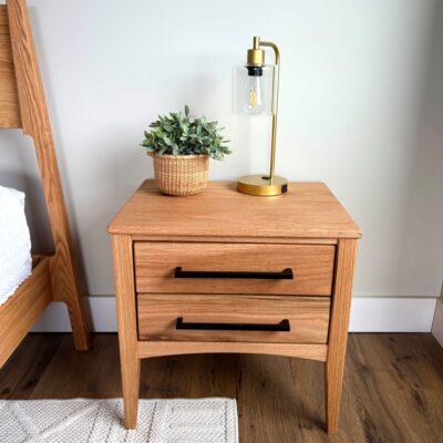 Add a beautiful matching Uinta 2 Drawer Nightstand to your Nomad bed frame. Like the mountains it is named after, the Uinta is solid and strong and will last a lifetime. It ships completely assembled and stands 22.5″ tall 22.5″ wide and 17″ deep, this nightstand will compliment any frame style from Nomad. The two drawers are 5″ tall and provide plenty of bedside storage. The drawer bottoms and side panels are made from a veneered product. Available in both Maple and Oak and with all our finish options. Standard Shipping is 3-4 weeks.